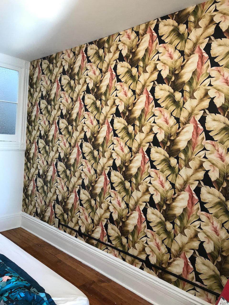 Traditional vinyl wallpaper on old plaster wall, done as an accent wall.