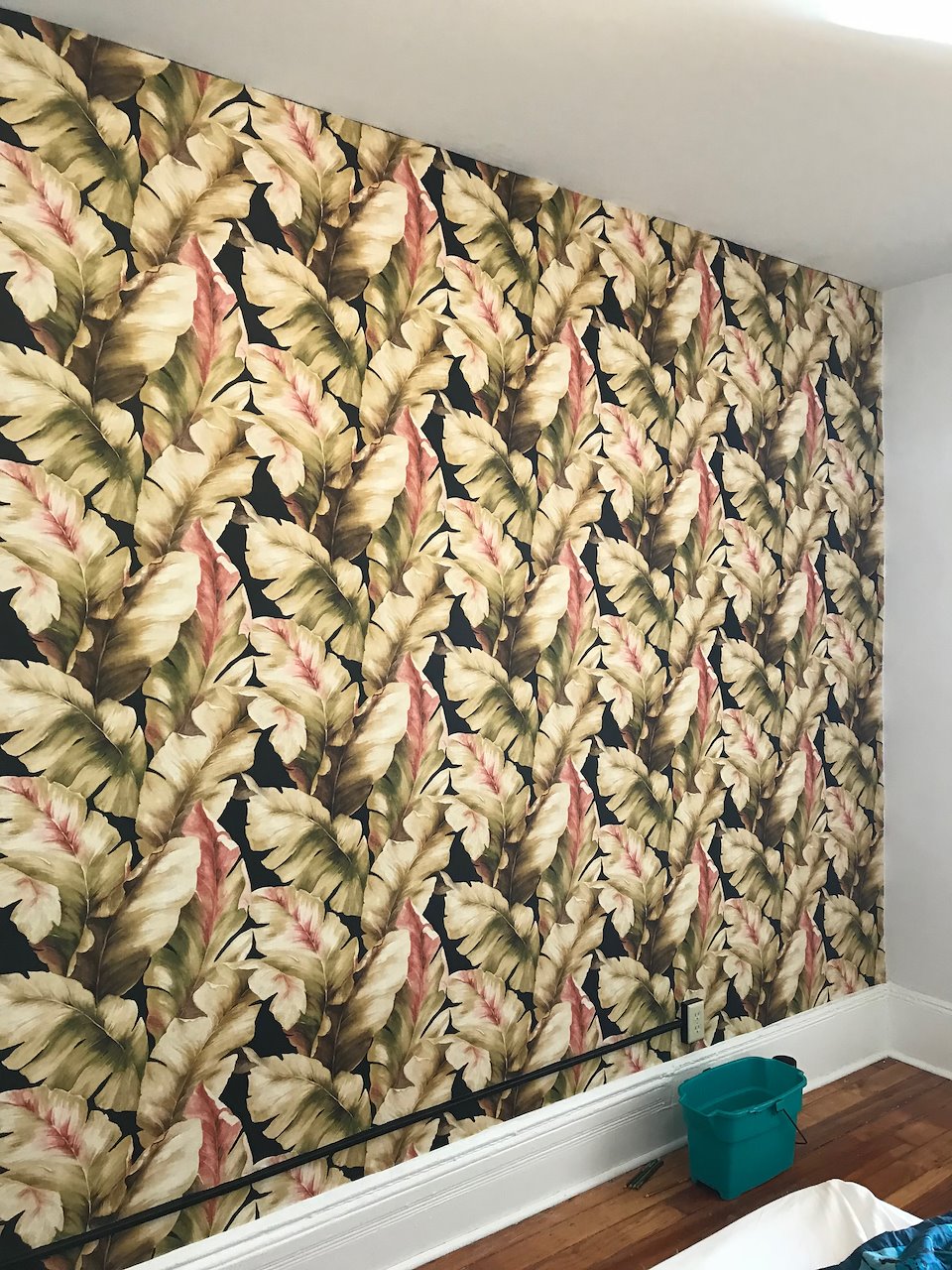 We prepped the wall, sanding and filling holes and bumps as well as could be, considering the age and hand skimmed quality of an old plaster wall. Then primed it with a wallpaper primer, and installed the wallpaper. Prep and priming took one day, then installation took another day.