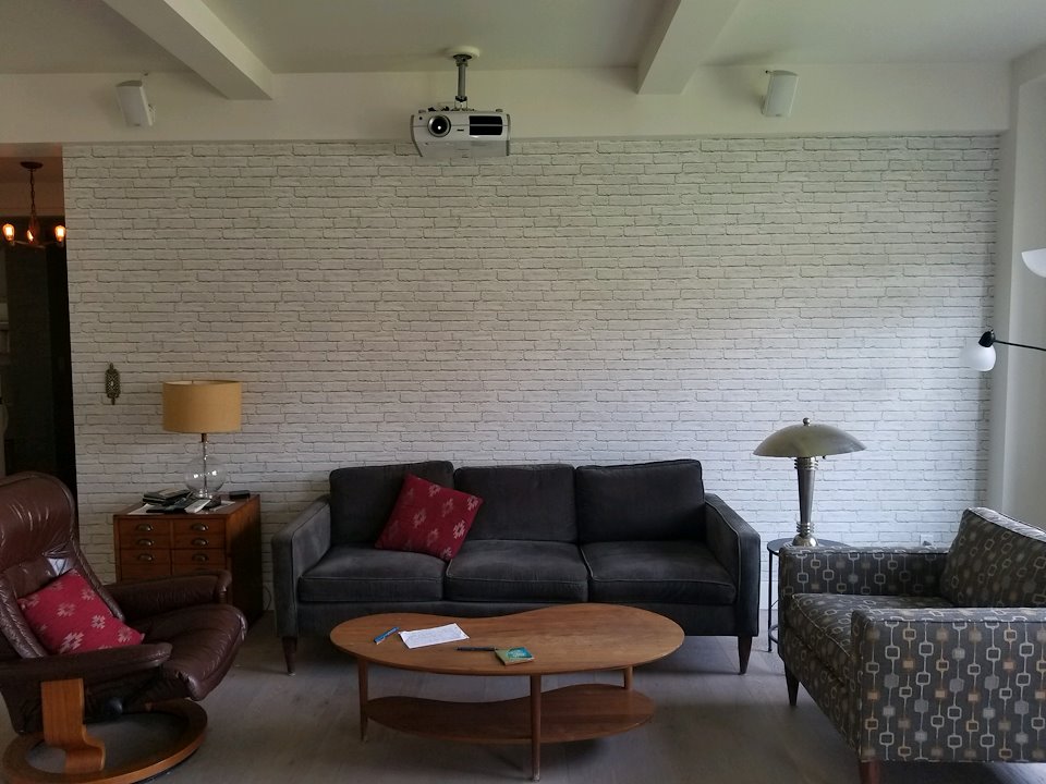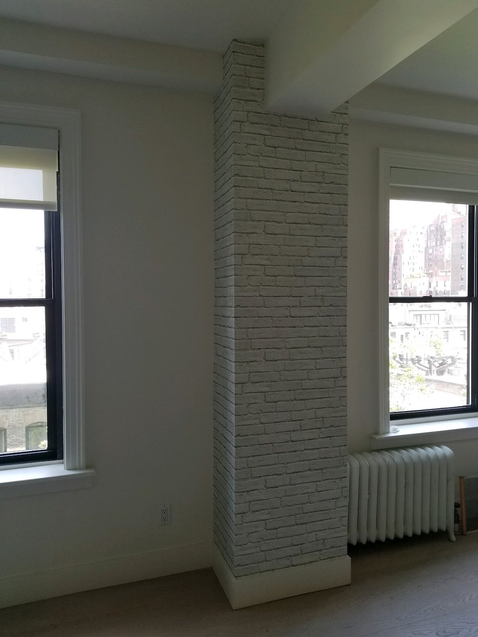 This was done with the new vinyl stick on wallpaper. I was called in to redo the wall. It had originally been installed without using proper tools to insure that it was level and plumb. As you can see, it is a brick pattern and required that it be level and would be very noticeable if it was not.