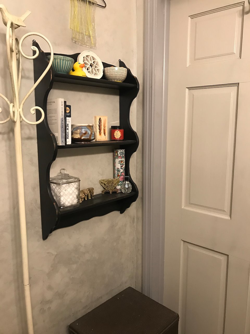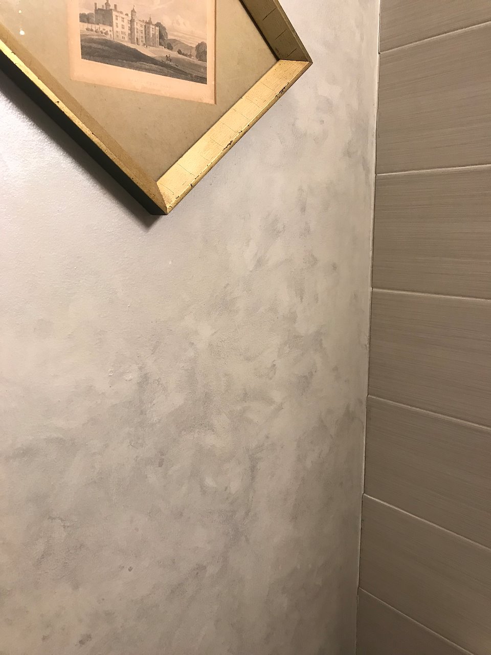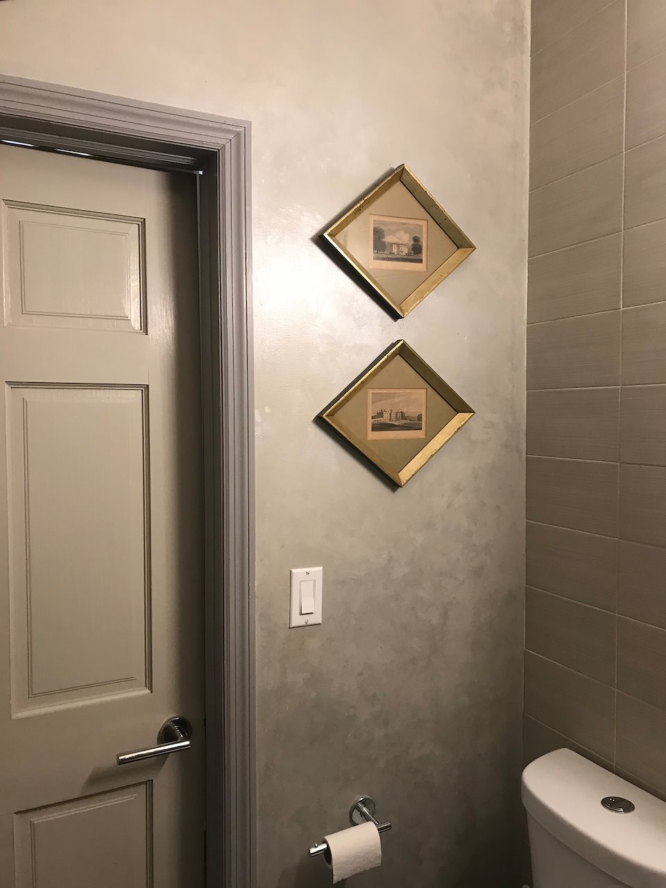 Matching the colors of the tile, I used a silver metallic glaze over a taupe base color and rag-rolled it on the wall.