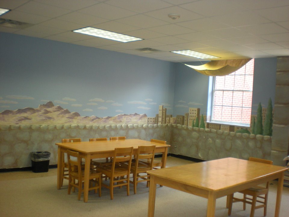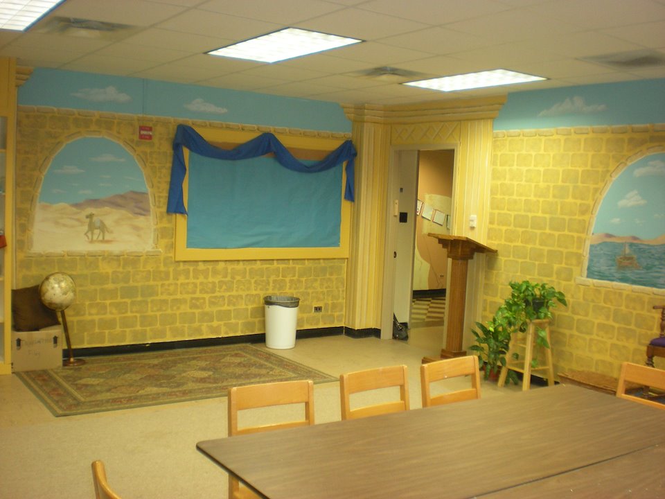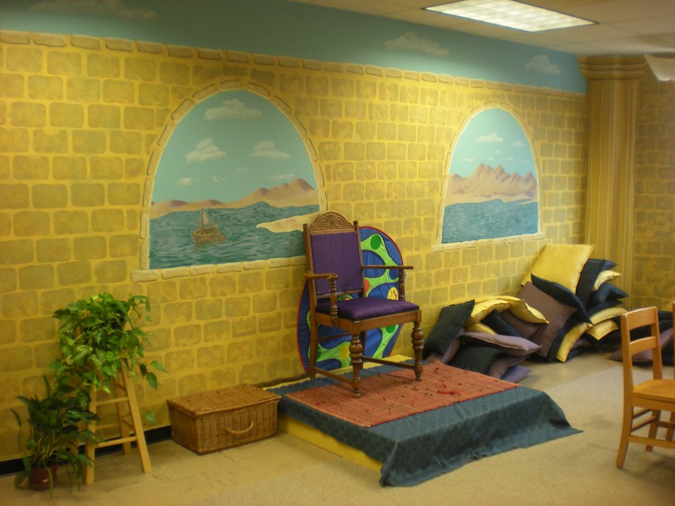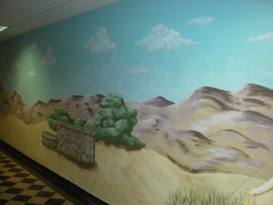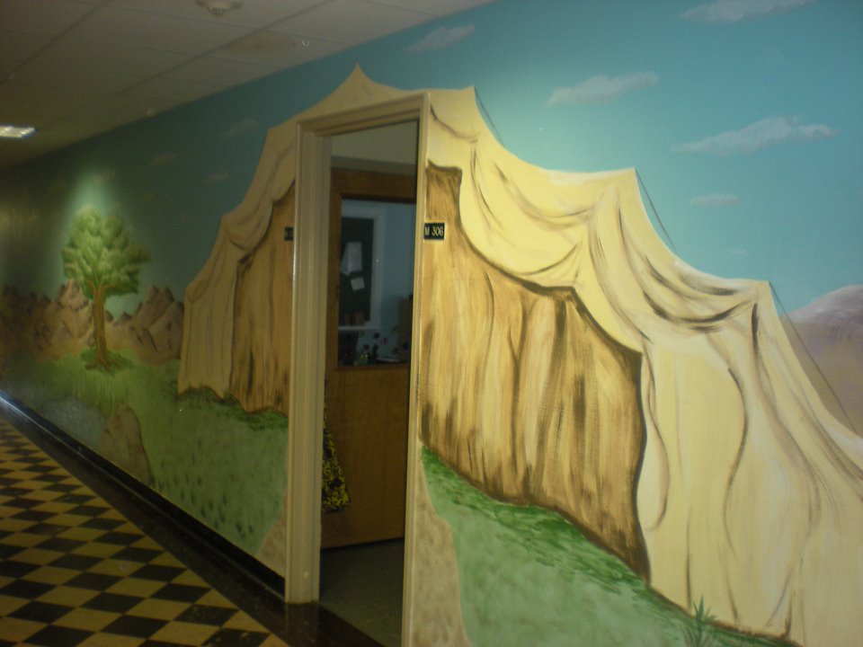 Theatrical set painting techniques to bring bible stories to life and surround the students in the classrooms
