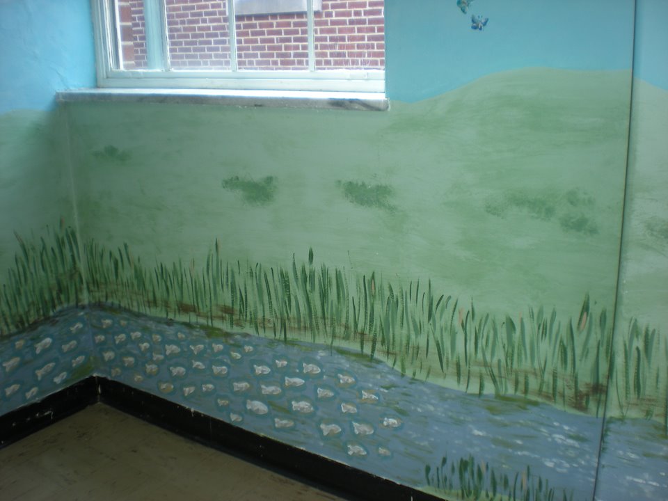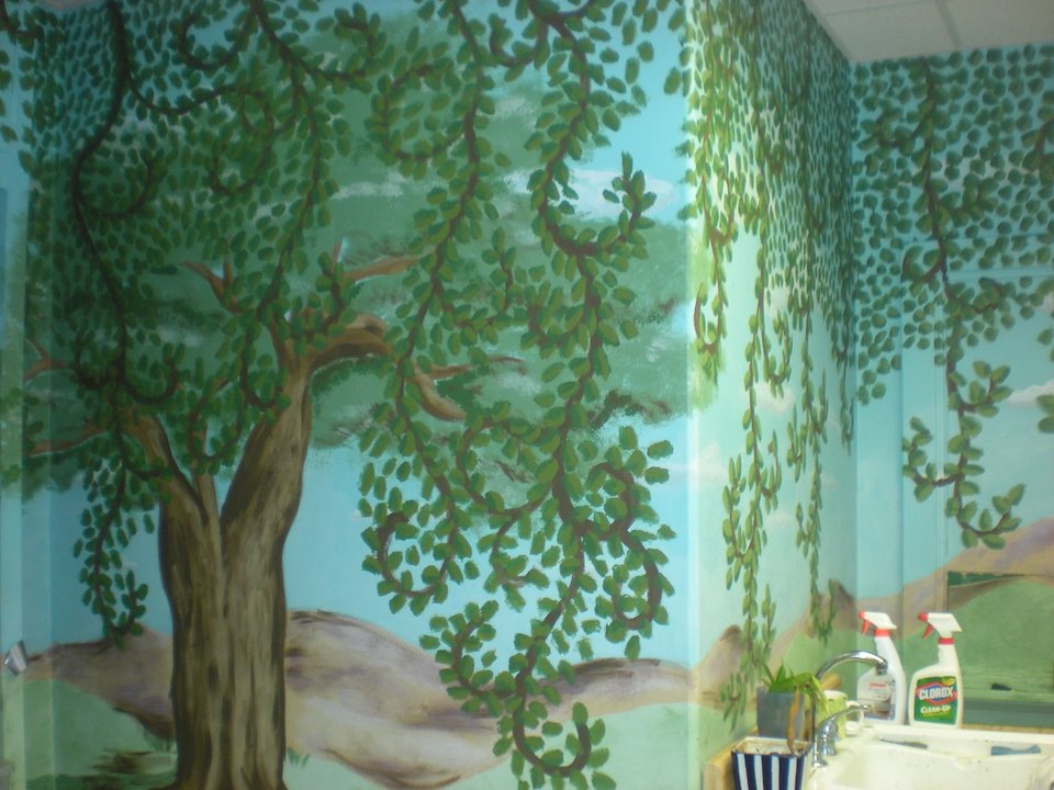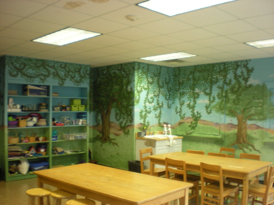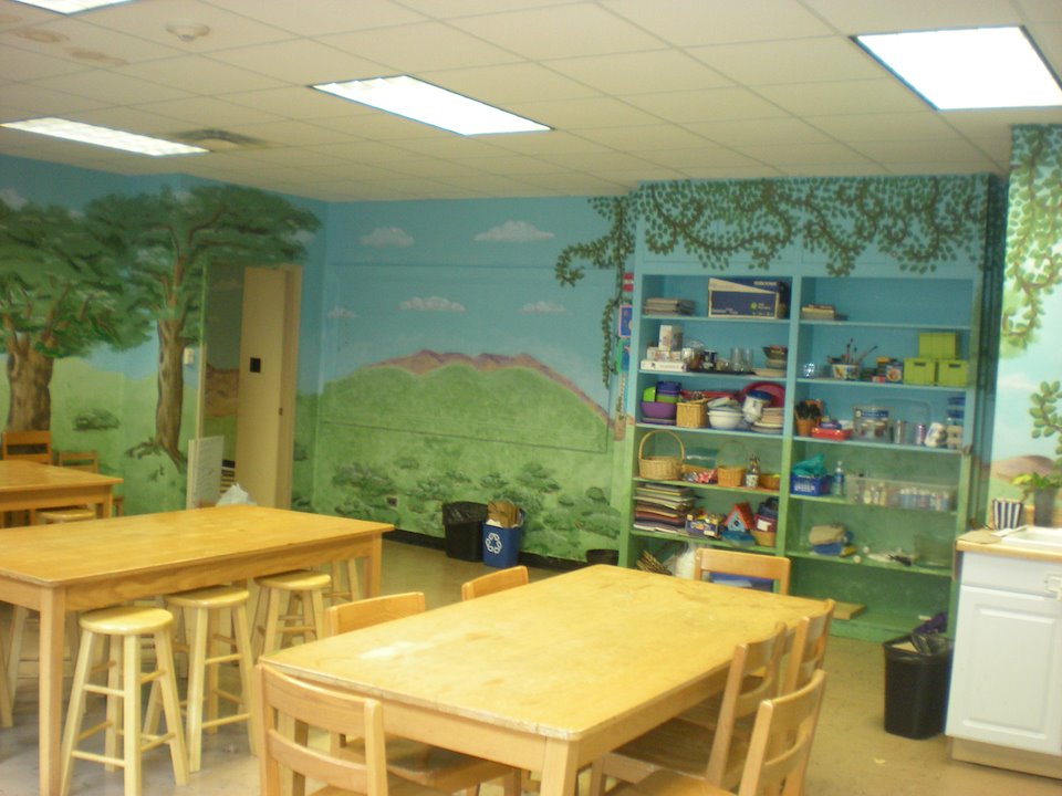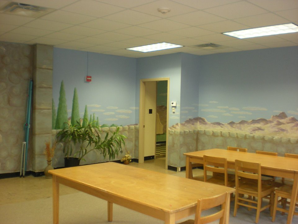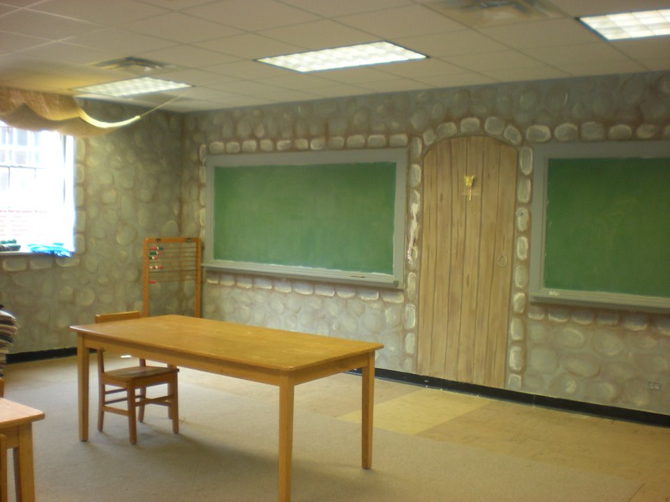 Theatrical set painting techniques to bring bible stories to life and surround the students in the classrooms