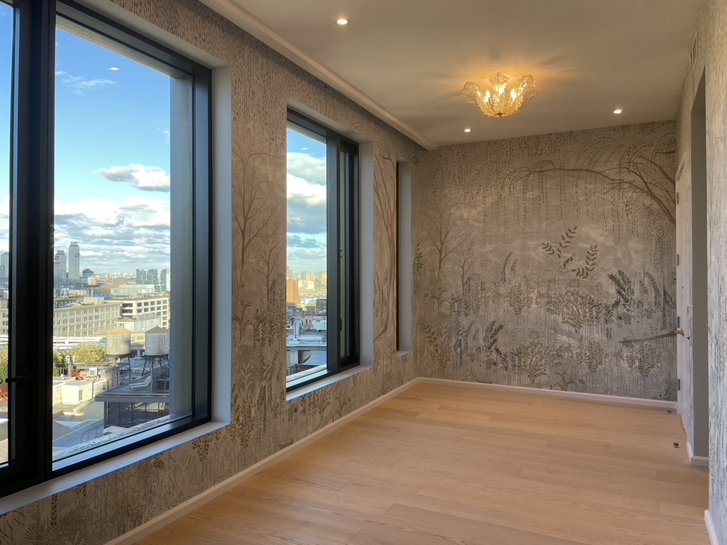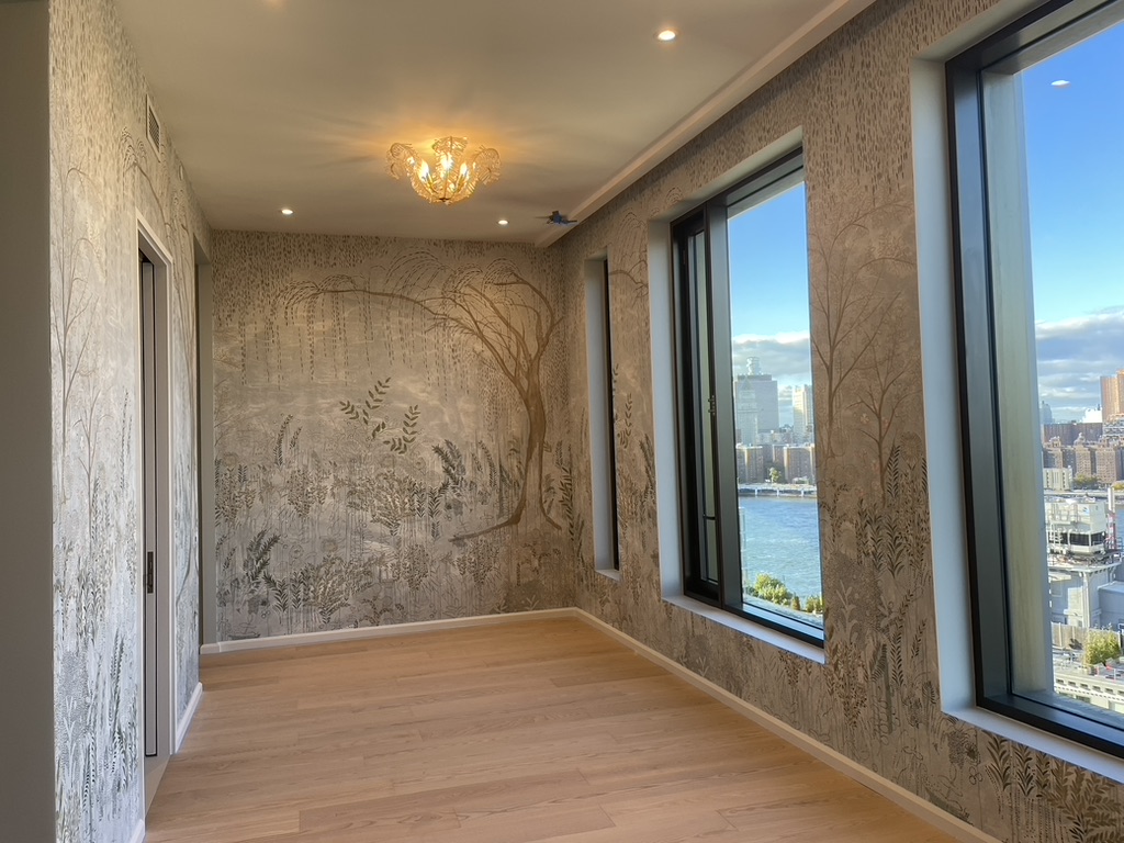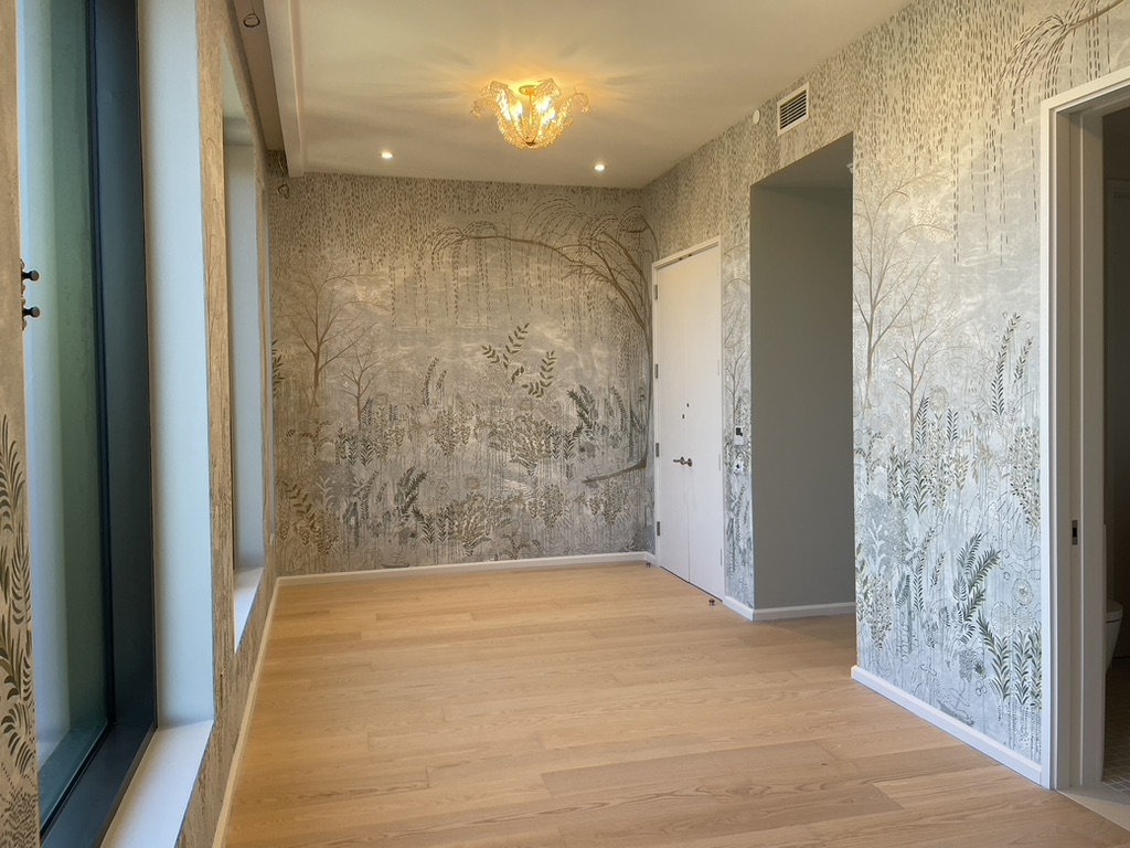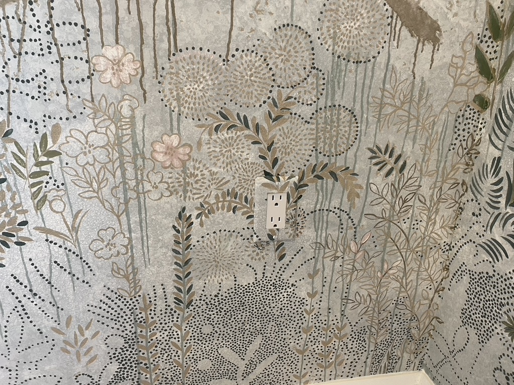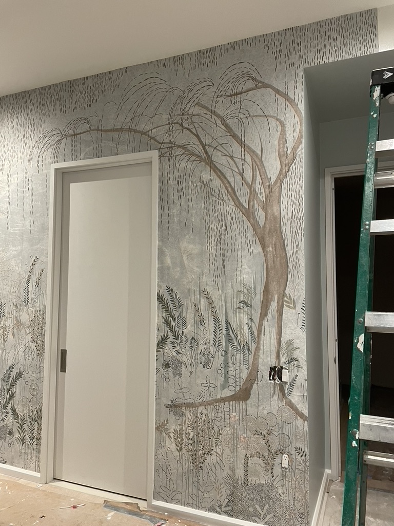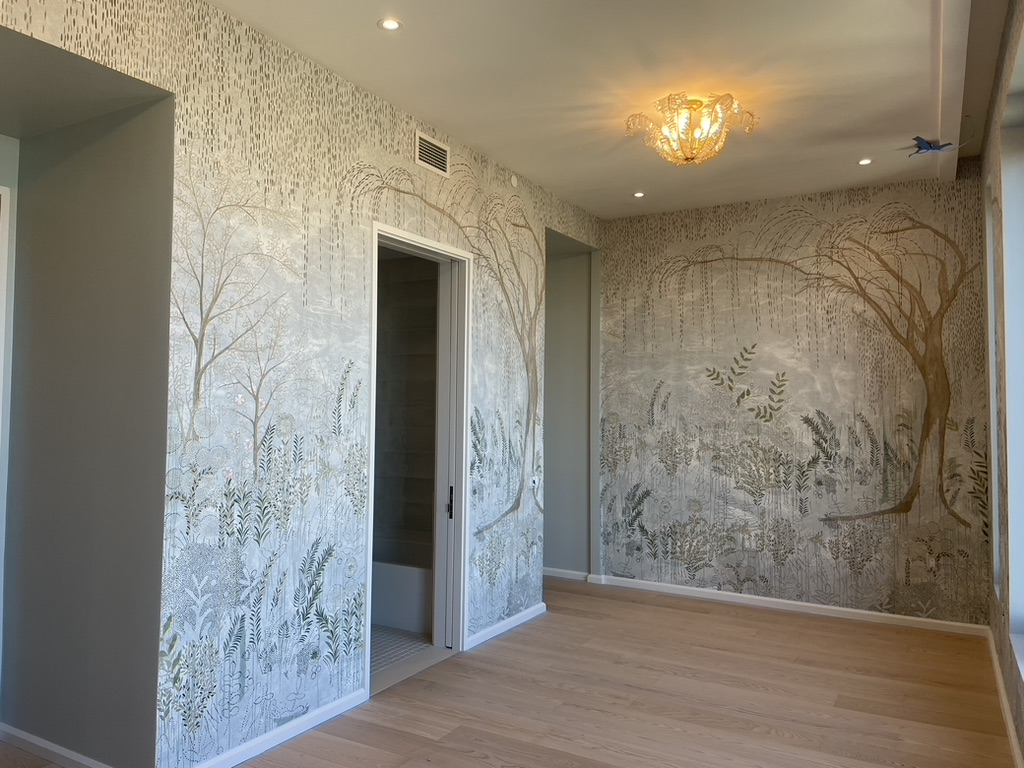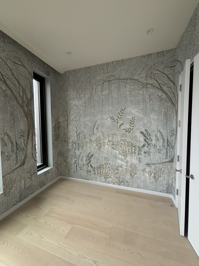 Continuous panel mural matched around the room, painted corners to match pattern to look seamless