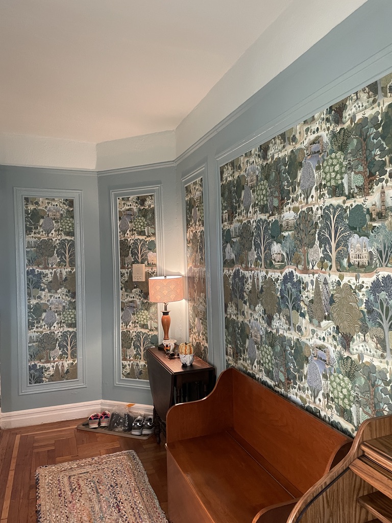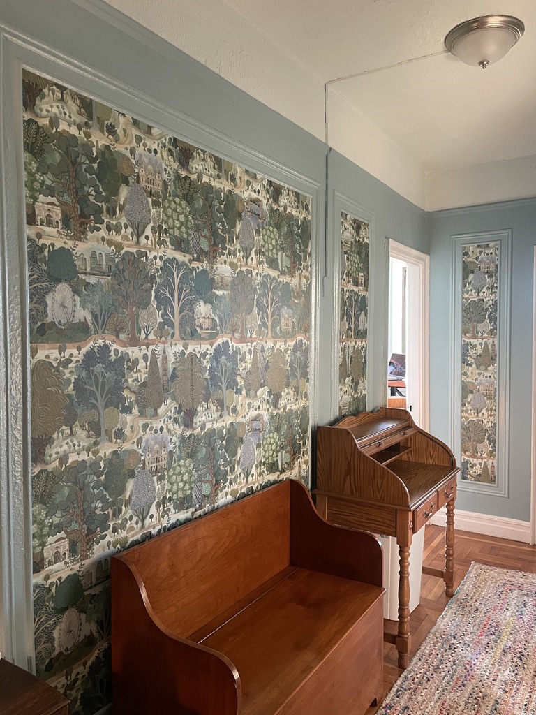 Existing picture frame details in hall with wallpaper inserts to give the entry a flair and some style